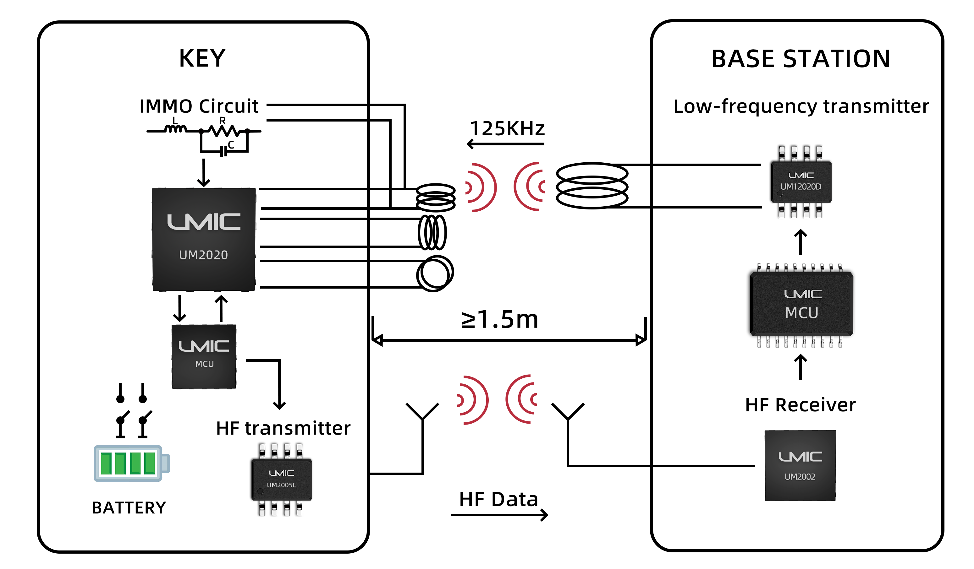 AG庄闲集团 基于低功耗高性能低频接收SoC芯片UM2082F08、FSK(OOK)发射芯片UM2001(或2.4G发射芯片UM2052)组成的钥匙方案,以及采用AG庄闲集团 低功耗32位MCU芯片UM3213A、FSK(OOK)接收芯片UM2002(或2.4G接收芯片UM2052)组成基站发射端,构成完整PKE解决方案。